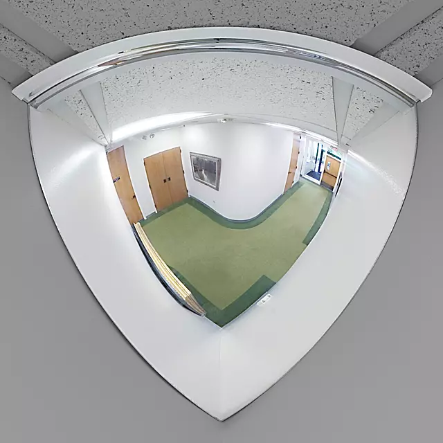 Eliminate blind spots in warehouses and offices. Prevent collisions at corners, intersections and aisles. 2 way. Mounts snugly in corner. For 90° views at “L” intersections. Lightweight shatterproof acrylic. Mounting hardware included.