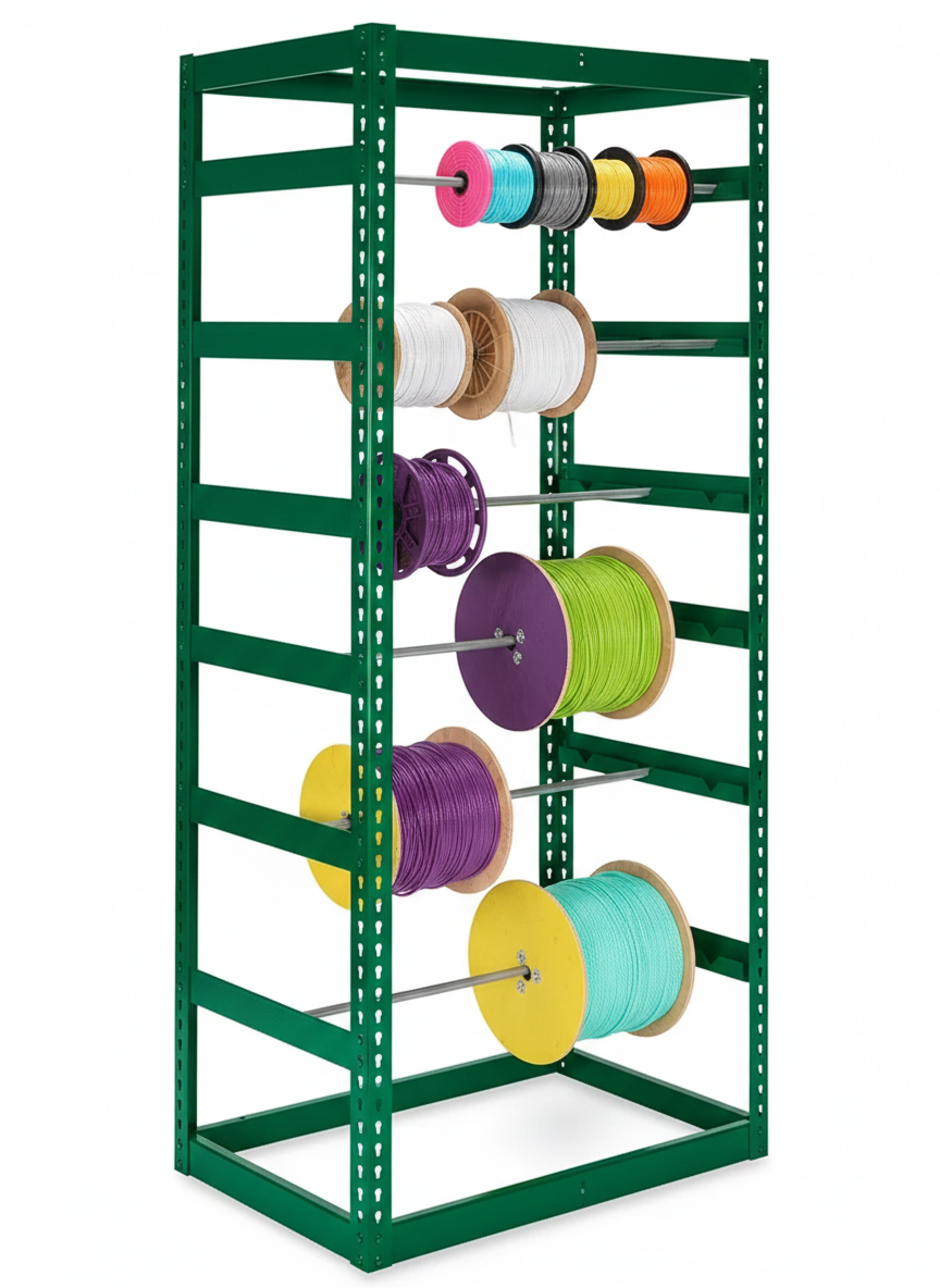 Store and dispense wire, rope and tubing with adjustable rack. 6 levels vertically adjust in 1 1/2″ increments to customize storage. Each level can hold up to 3 axles. Includes six 5/8″ diameter axles. 14-gauge powder-coated steel construction.