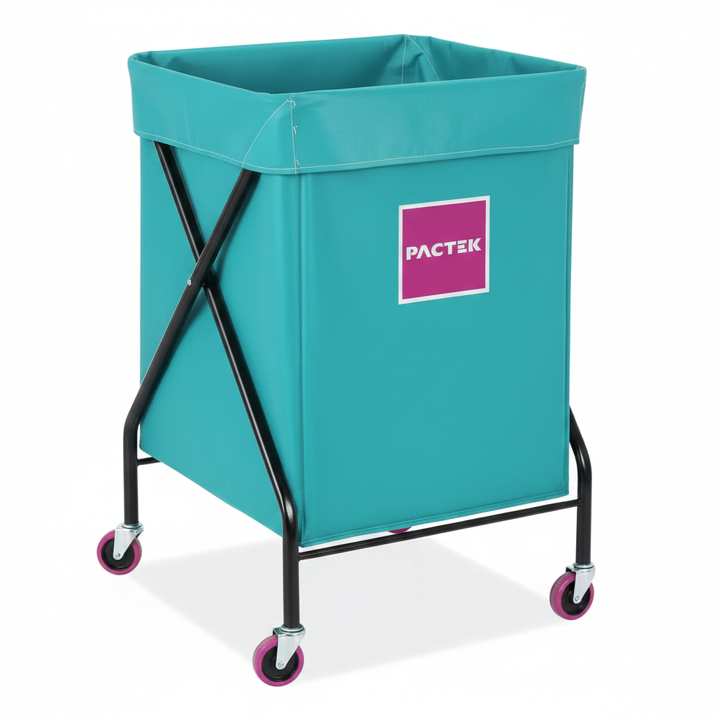 Collect returned merchandise and wheel it back to stock. Collapsible for easy storage in fitting areas and stockrooms. Removable, washable vinyl liner resists mildew and tearing. Powder-coated steel x-frame. 3″ non-marking swivel casters.