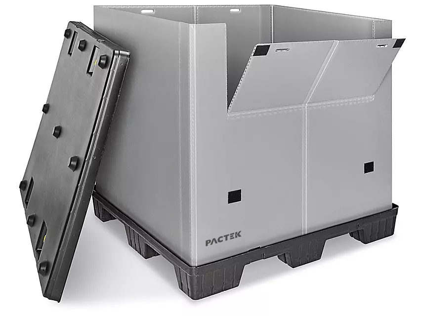 Sliding tabs snap into place securing sleeve, pallet and lid.