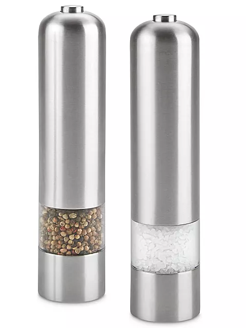Sleek, modern look. Grinds smoothly at the touch of a button. Stainless steel body. Acrylic window. Fine and coarse settings. Bottom light for candlelit dinners. Requires 8 “AA” Batteries, sold separately.