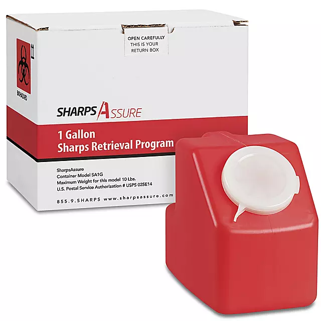 All-in-one kit for safe storage and disposal of used needles and syringes.