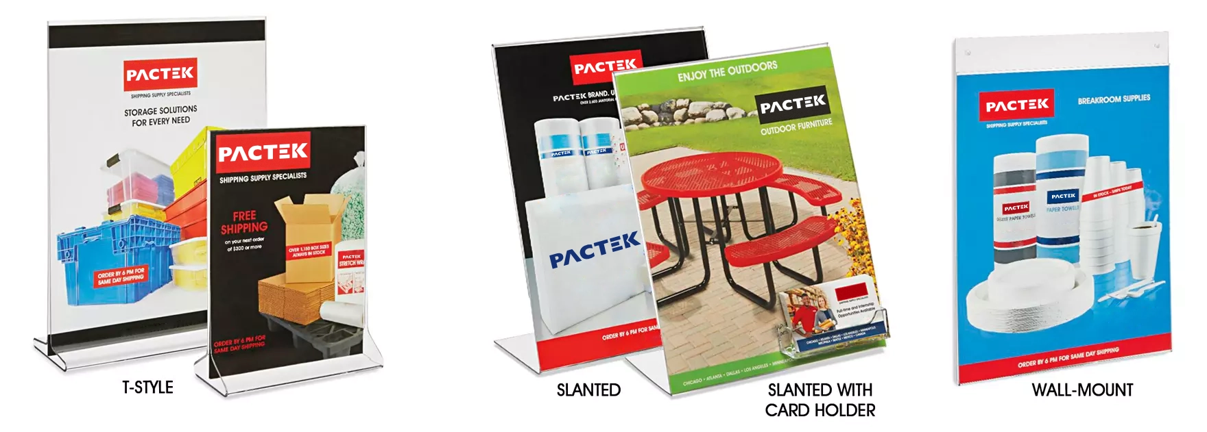 T-Style Sign Holders – Holds two sheets back-to-back or one two-sided sheet. Easy top-loading. Slanted Sign Holders – Shows off single-sided materials. Side loading. Wall-Mount Sign Holders – Predrilled holes for easy installation. Top loading.