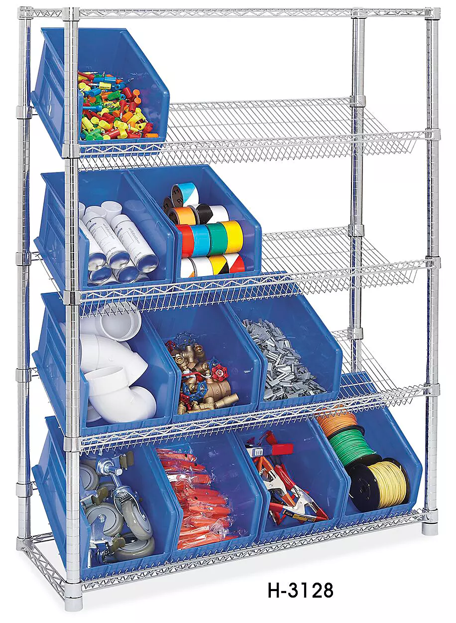 5 Shelf Unit with Bins – Includes 16 durable plastic stackable bins for small parts storage.