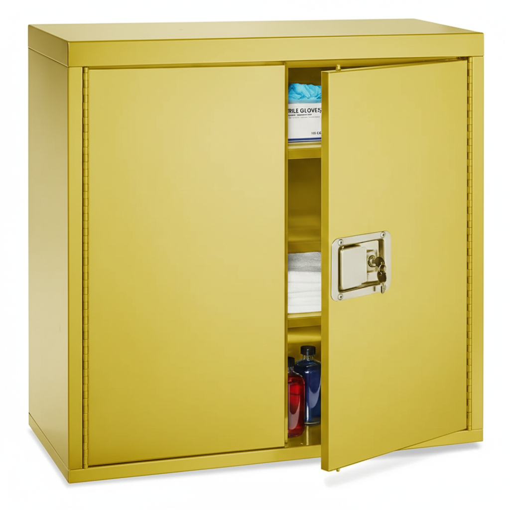 Secure, overhead storage for restaurants, labs and doctors’ offices. All-welded, type 304 stainless steel resists corrosion. Recessed locking handle. Shelves adjust in 2″ increments. 150 lb. shelf capacity. Mounting hardware included.