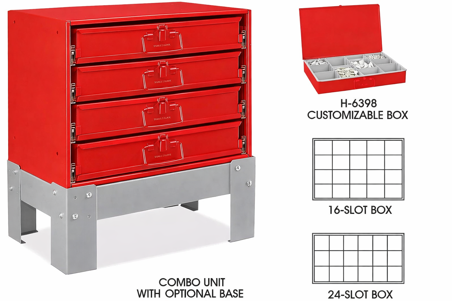 Portable drawers move to the job site easily. Store neatly when done. Welded steel boxes. Tough plastic compartment trays. H-6398 – Removable dividers for custom storage. H-6401 – Outer welded steel cabinet with incredibly smooth drawer slides.