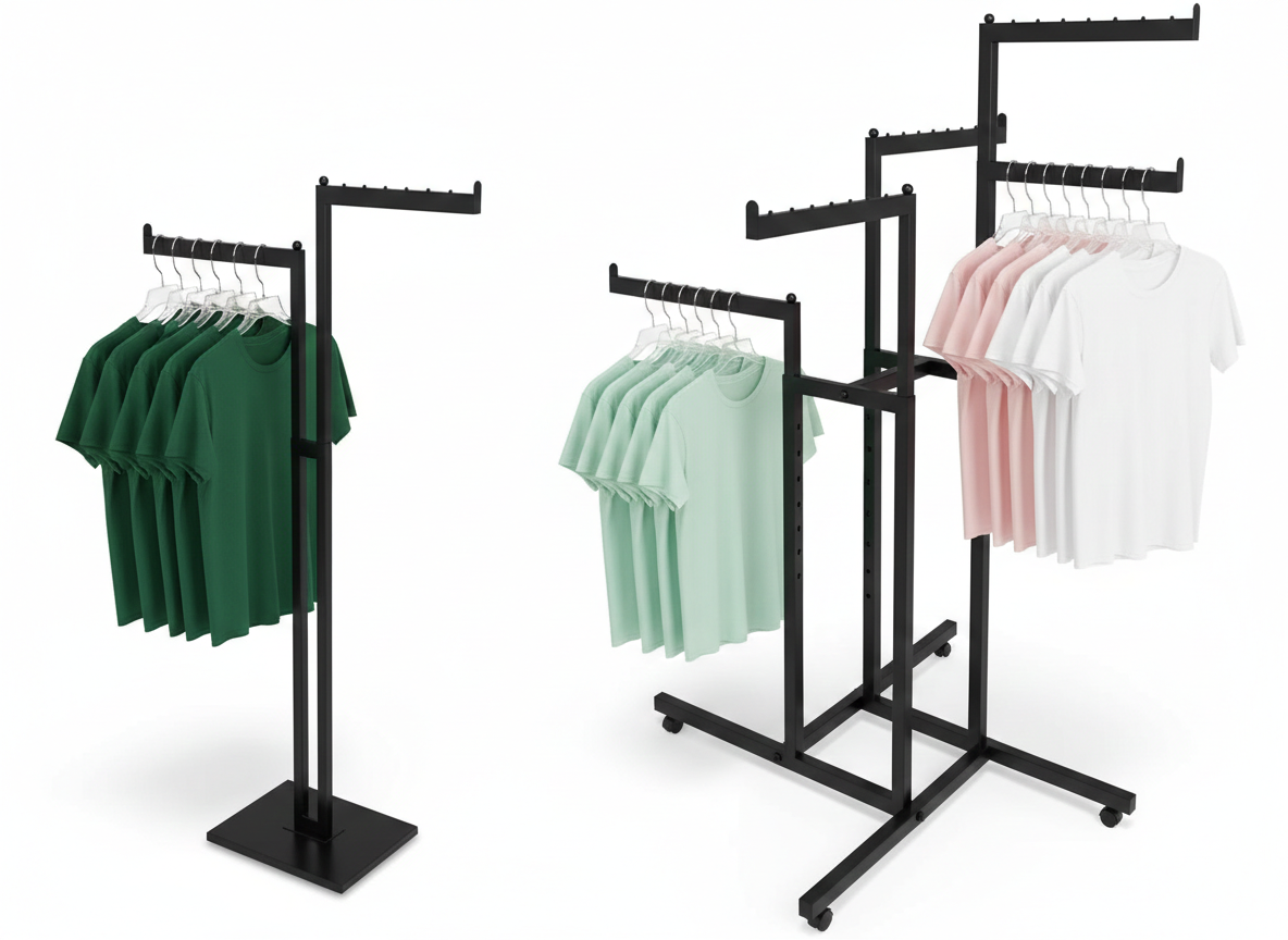 Display your merchandise on these easy-to-shop racks. 2 Way – Hang T-shirts, coats or dresses. Solid weighted base. 4 Way – Used for heavier coats and sweatshirts. Optional casters available.