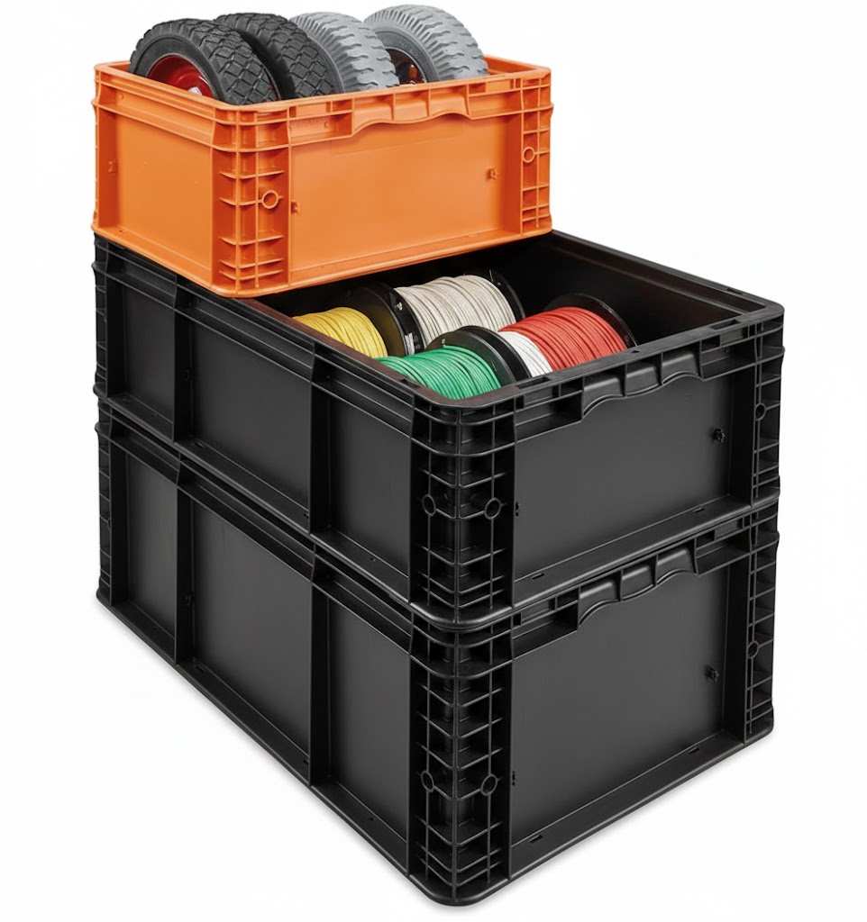 Reinforced containers for work-in-process, shipping and storage.