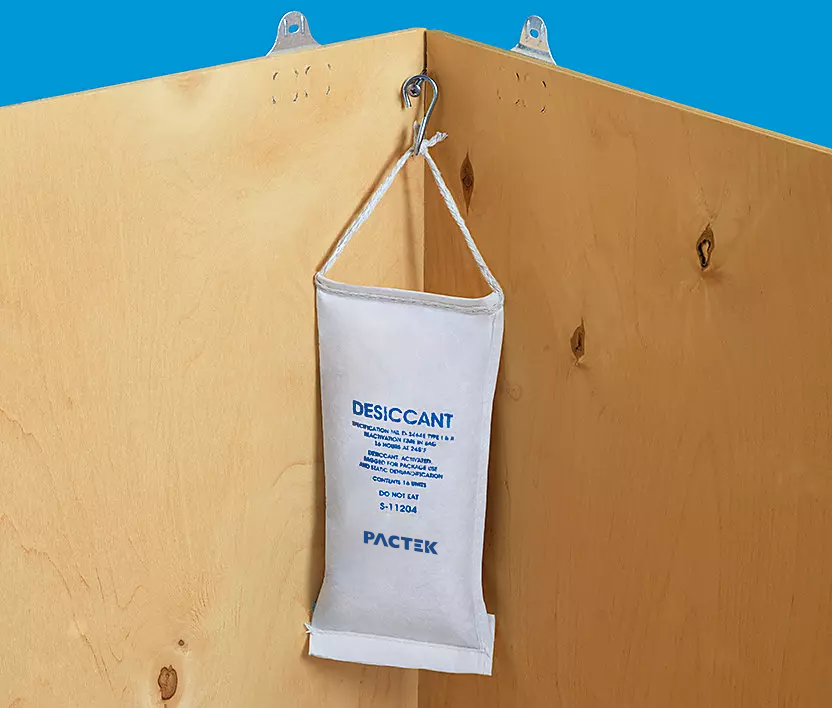 Hang desiccant inside crates or tie to large equipment during shipping or storage. Activated clay adsorbs moisture. Tough non-woven rayon/polyester bag.