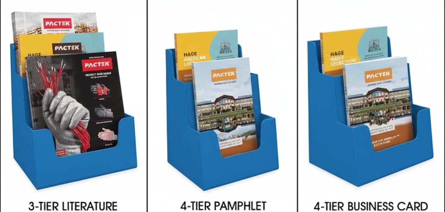 4-Tier Pamphlet – Holds standard tri-fold brochures.