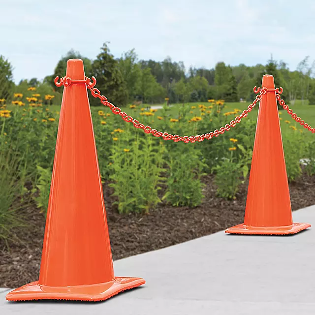 Create a cone zone in parking lots, driveways and job sites. Weatherproof, UV-resistant plastic chain cuts easily to size. Kit includes 6-2¾” cone collars and 50 ft. of chain. Collars fit over 18″ or taller Traffic Cones, sold separately.