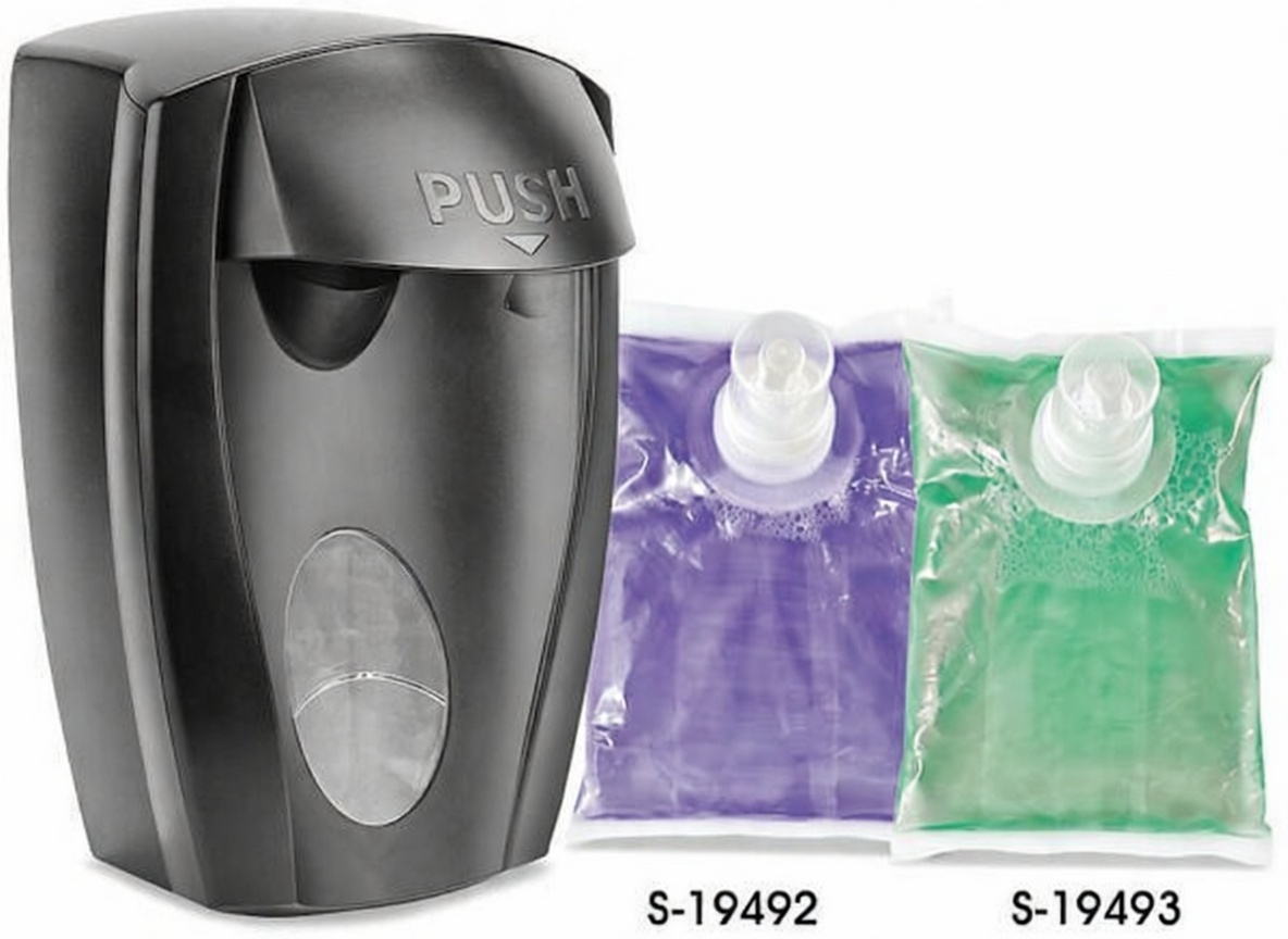 Push Dispenser – Large window to monitor soap level. No batteries needed.