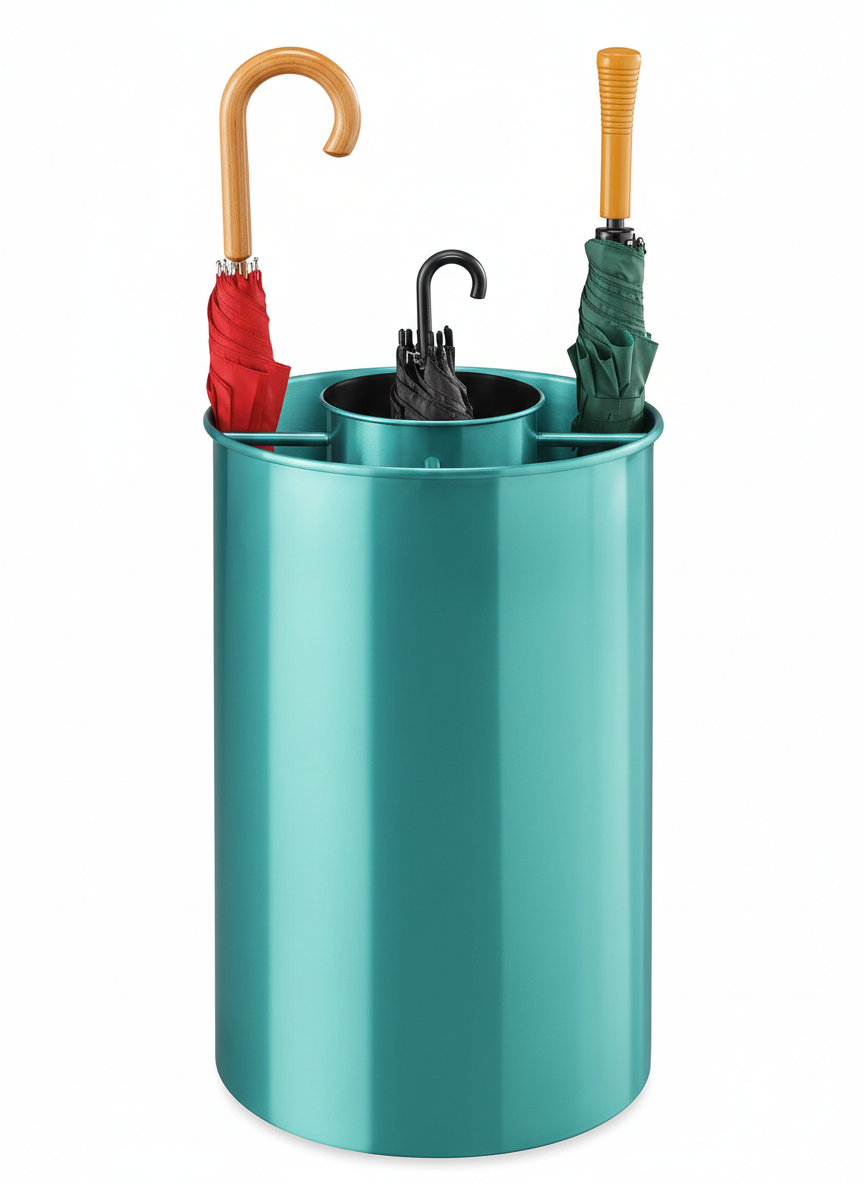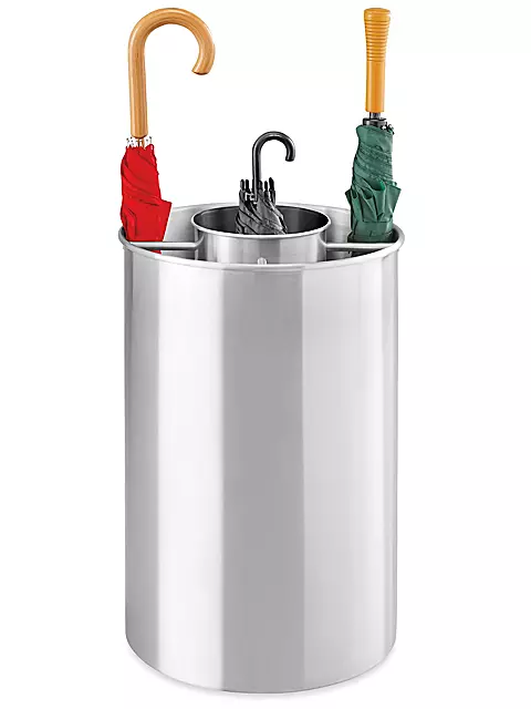 Not your average umbrella stand. Outer ring holds full-size umbrellas, inner holds 1/2 size. Aluminum construction will not rust. Smooth satin finish. Holds up to 30 umbrellas.
