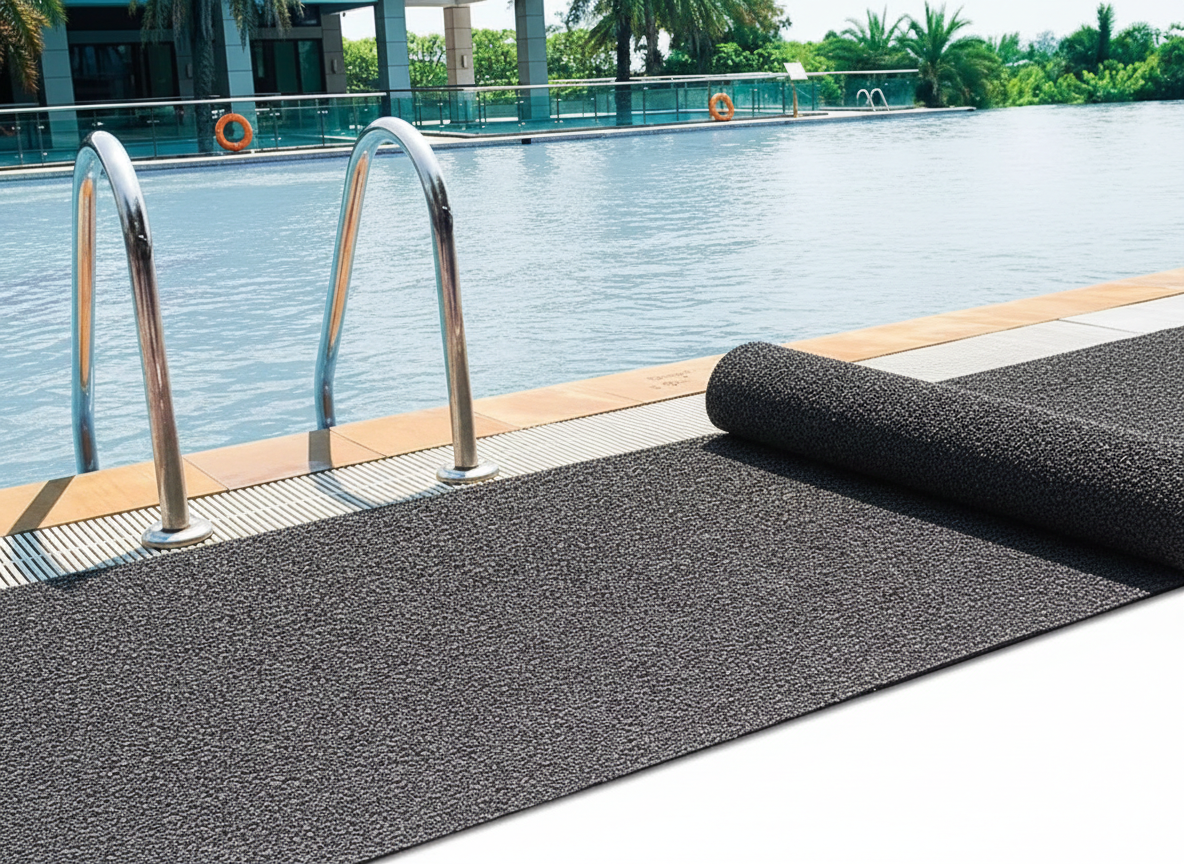 Textured spaghetti loop design provides padding and prevents slips. Recommended for locker rooms, clubhouses and pools. Spray down for quick cleaning. Resists mildew. No backing allows for quick drainage. Trim to desired size with utility knife.