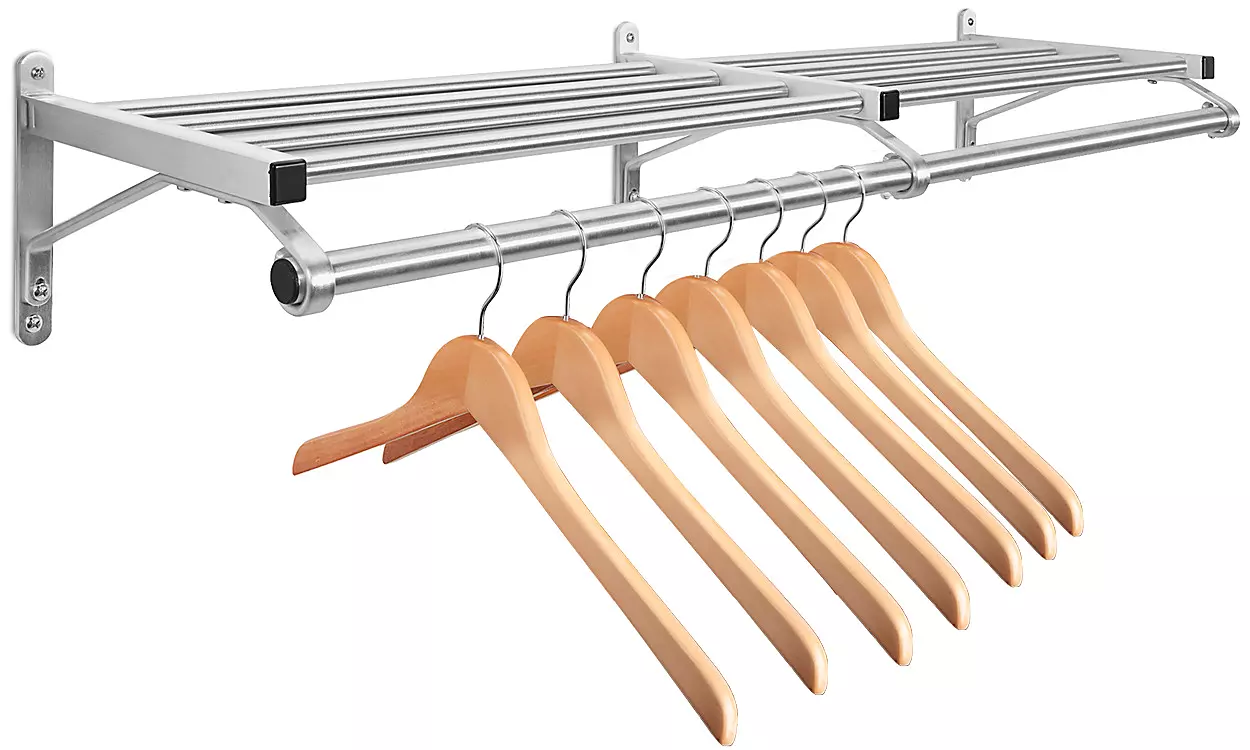 Holds up to 30 coats with shelf for gloves, hats and storage.