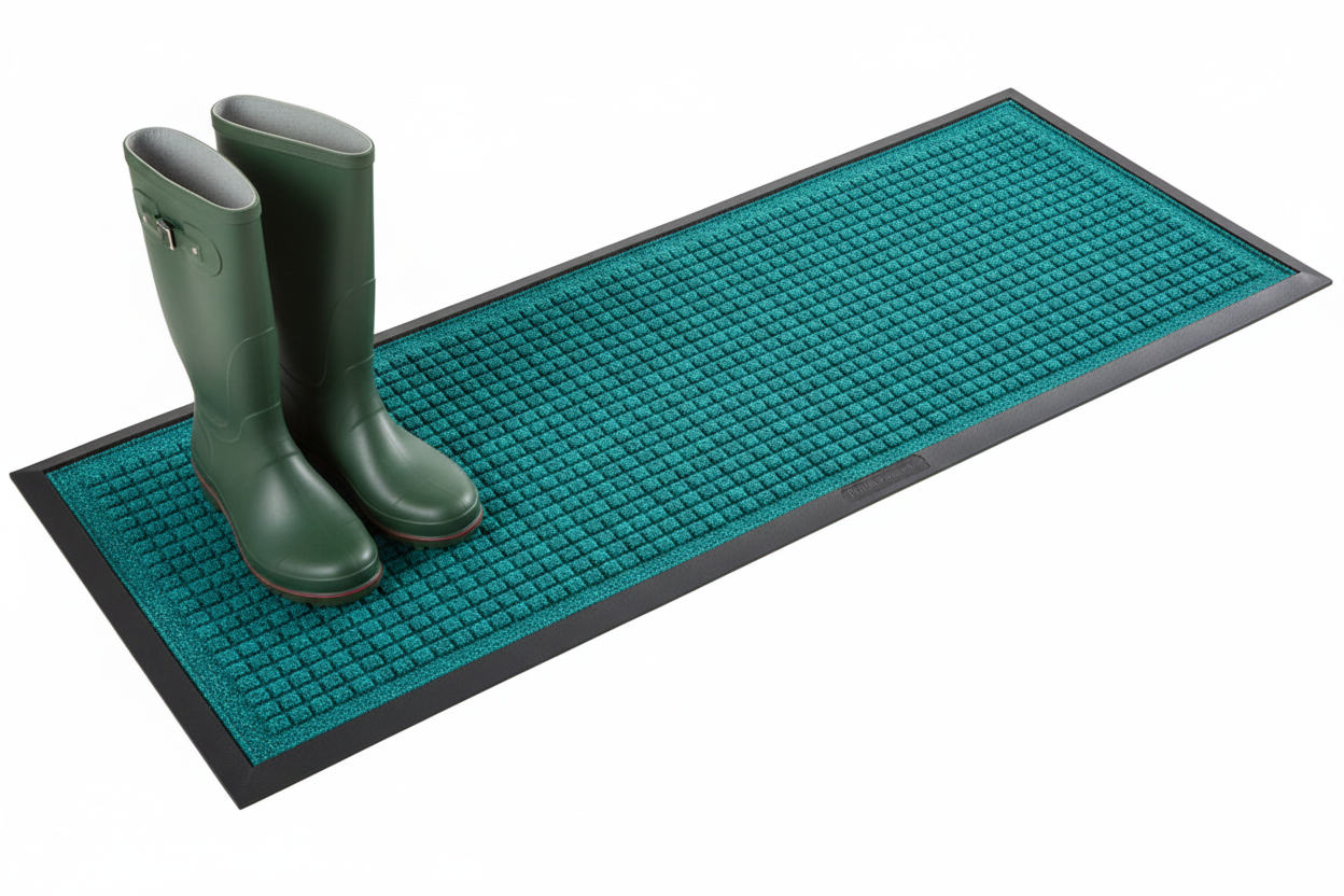 Check your muddy boots at the door. Cleated rubber backing prevents slippage. Heavy duty PET polyester fabric with raised border.