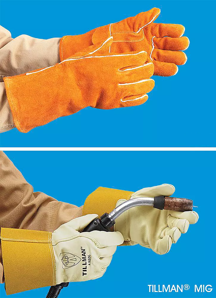 Cowhide with Kevlar stitching. TIG – For low spark welding.