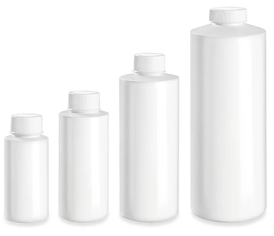 Opaque white color hides and protects contents. Use for detergents, cleaners and dyes. Shaped for easy labeling. Made of white, impact-resistant HDPE. FDA compliant. Caps included.