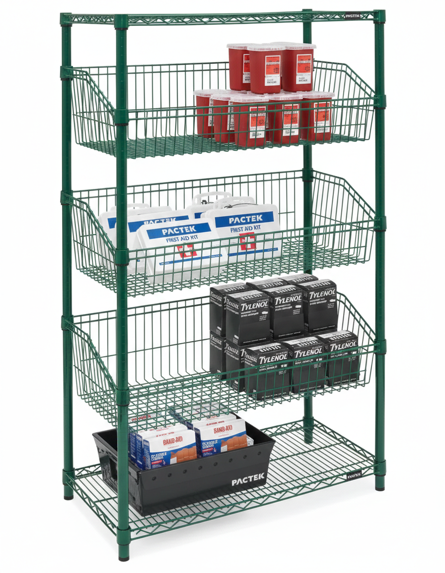 Keep loose items organized and visible in stores, stockrooms and fulfillment areas. Baskets prevent items from falling off. Open wire maximizes airflow, reduces dirt and dust buildup. Shelves adjust in 1″ increments. Basket Dividers create various compartments. NSF certified. Optional 5″ polyurethane swivel casters.