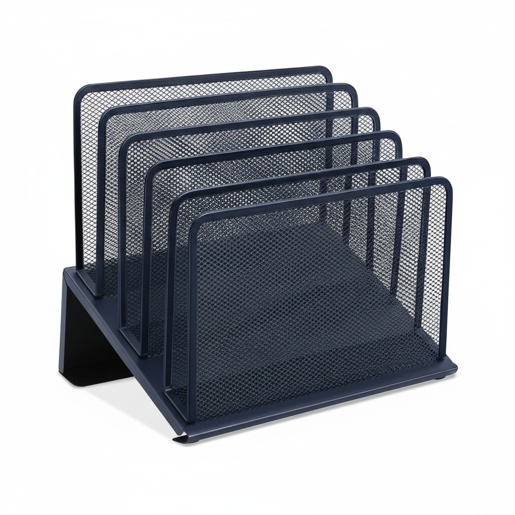 Keep desktops clean, clear and clutter free. 5 slots to keep active files organized. Black wire mesh design with smooth rolled edges.
