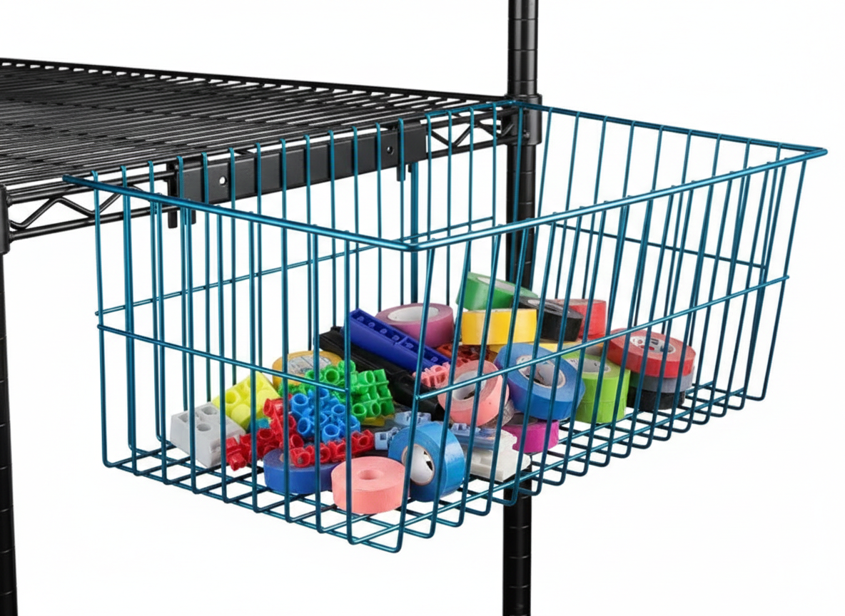 Attach to shelving or carts for added storage. Easily hooks to shelf. No hardware required. Holds small, loose items that may roll off shelves.
