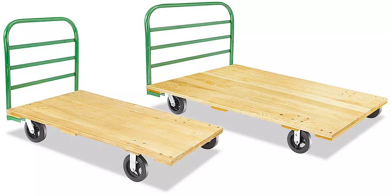 Whisper smooth, ultra quiet. Used in warehouses, industrial and office spaces. Tough wood deck. Underside reinforced with 4 cross boards. Welded steel handle. 8″ casters: 2 swivel, 2 rigid.